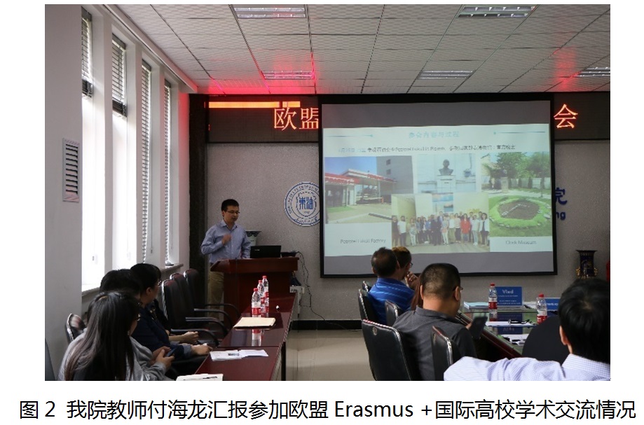 新葡萄官网教师付海龙代表3位出访罗马尼亚普洛耶什蒂石油和天然气大学教师发言。他首先汇报了参加欧盟Erasmus+国际高校学术与教育交流大会的基本情况,并着重谈了此次参加会议的收获和体会,充分展示了欧盟框架下,世界高校进行国际教育交流强调互动性和多元化的大趋势,用切身感受说明了我校扩大国际合作与交流的必要性和紧迫性。