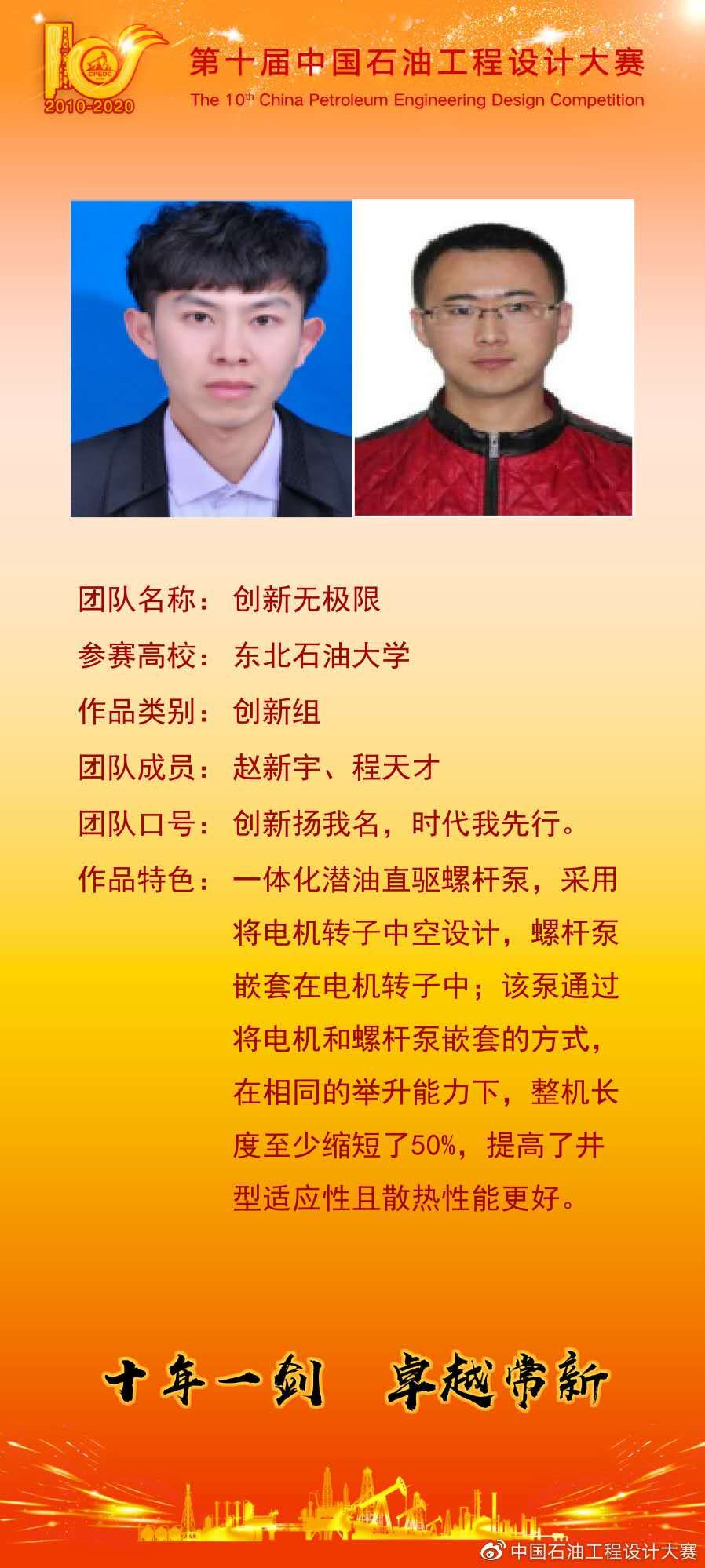 2020年6月13-14日,第十届中国石油工程设计大赛决赛在线上平台顺利举行。共有来自国内27所高校、国外5所高校的5000余名学生和700余名指导教师参与,提交有效作品979份,74支队伍入围全国总决赛。来自中国石油天然气集团公司、中国石油化工集团公司、中国海洋石油集团有限公司和斯伦贝谢公司的61名专家组成专家组,对入围全国总决赛的作品进行评审,评选出一等奖21项,二等奖49项,三等奖4项,我校共获方案设计组二等奖6项。其中由新葡萄官网赵新宇和程天才等研究生所完成的“机泵同体潜油直驱螺杆泵”、王中杨和胡金兆等研究生完成的“一体智能高效化精细分注装置”项目获得方案设计类二等奖,董康兴、王宝金两位老师获得优秀指导教师奖。