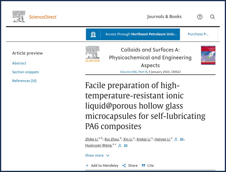 新葡萄官网李志科副教授在国际期刊《Colloids and Surfaces A: Physicochemical and Engineering Aspects》(IF=5.2)上发表题为“Facile preparation of high-temperature-resistant ionic liquid@porous hollow glass microcapsules for self-lubricating PA6 composites”的研究论文(DOI:https://doi.org/10.1016/j.colsurfa.2022.13052)。