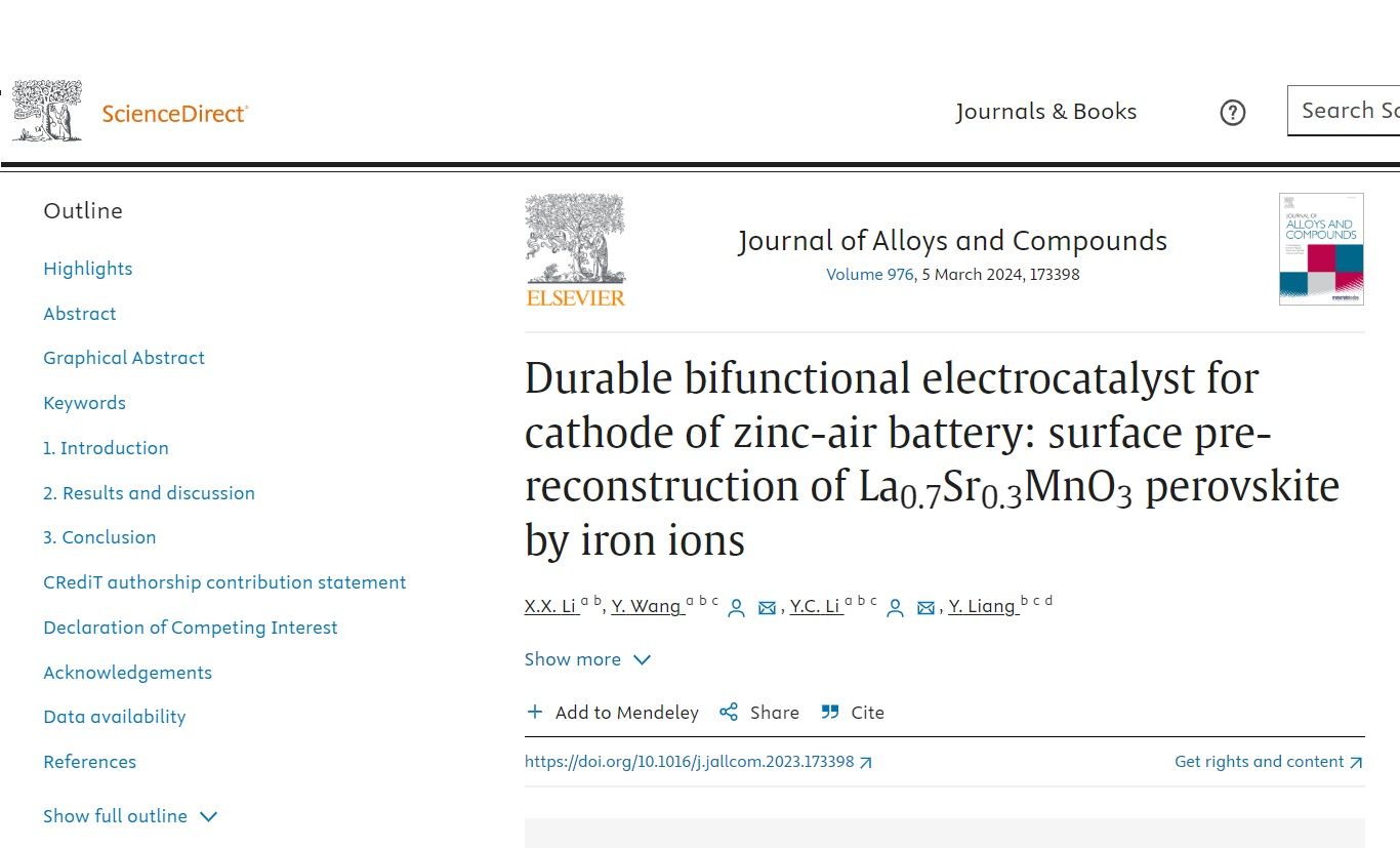 新葡萄官网2021级硕士研究生李肖雄在《Journal of Alloys and Compounds》(IF=6.20, SCI top期刊)上发表题为“Durable bifunctional electrocatalyst for cathode of zinc-air battery: surface pre-reconstruction of La0.7Sr0.3MnO3perovskite by iron ions”的研究论文。(DOI:https://doi.org/10.1016/j.jallcom.2023.173398)。