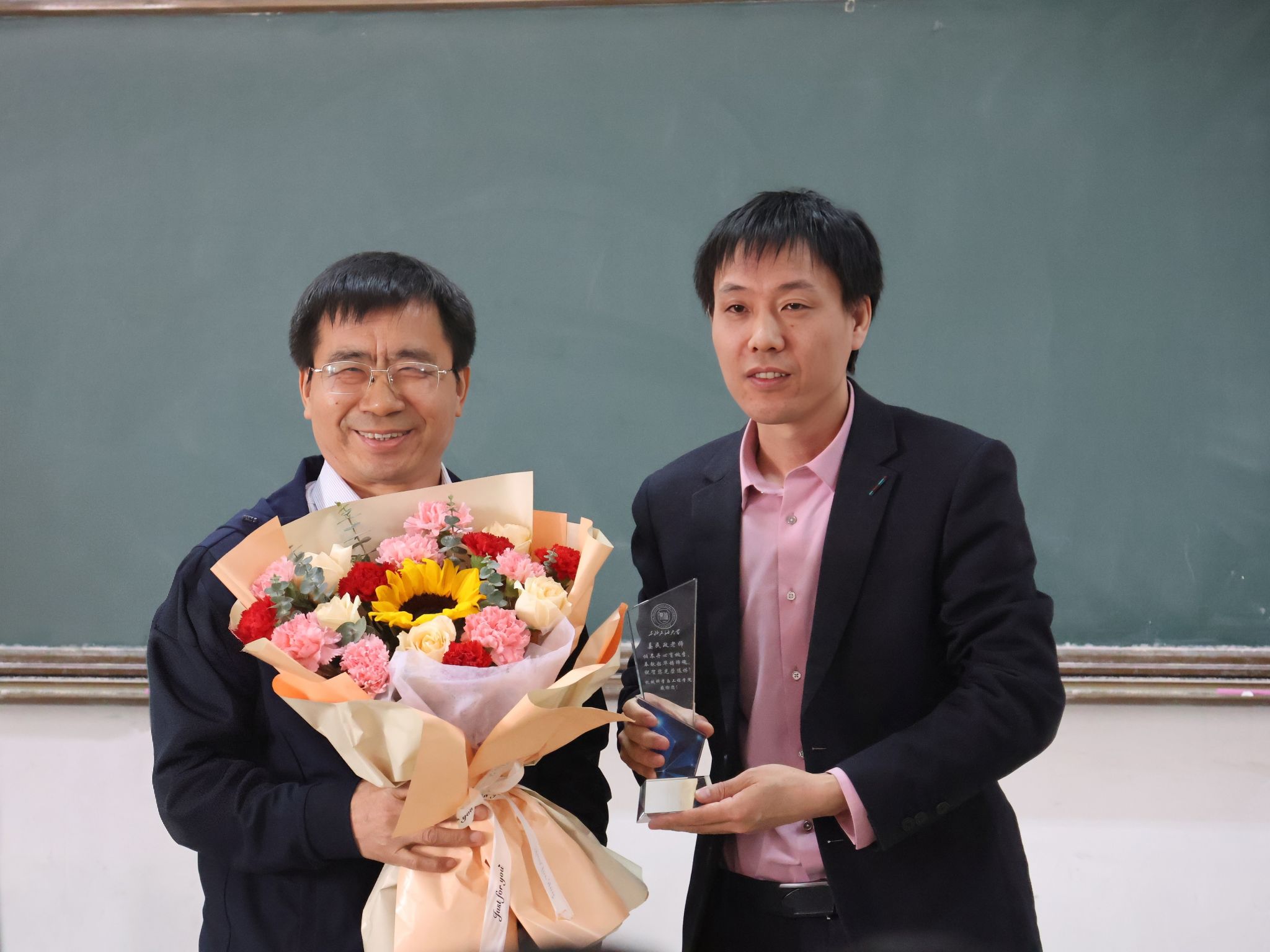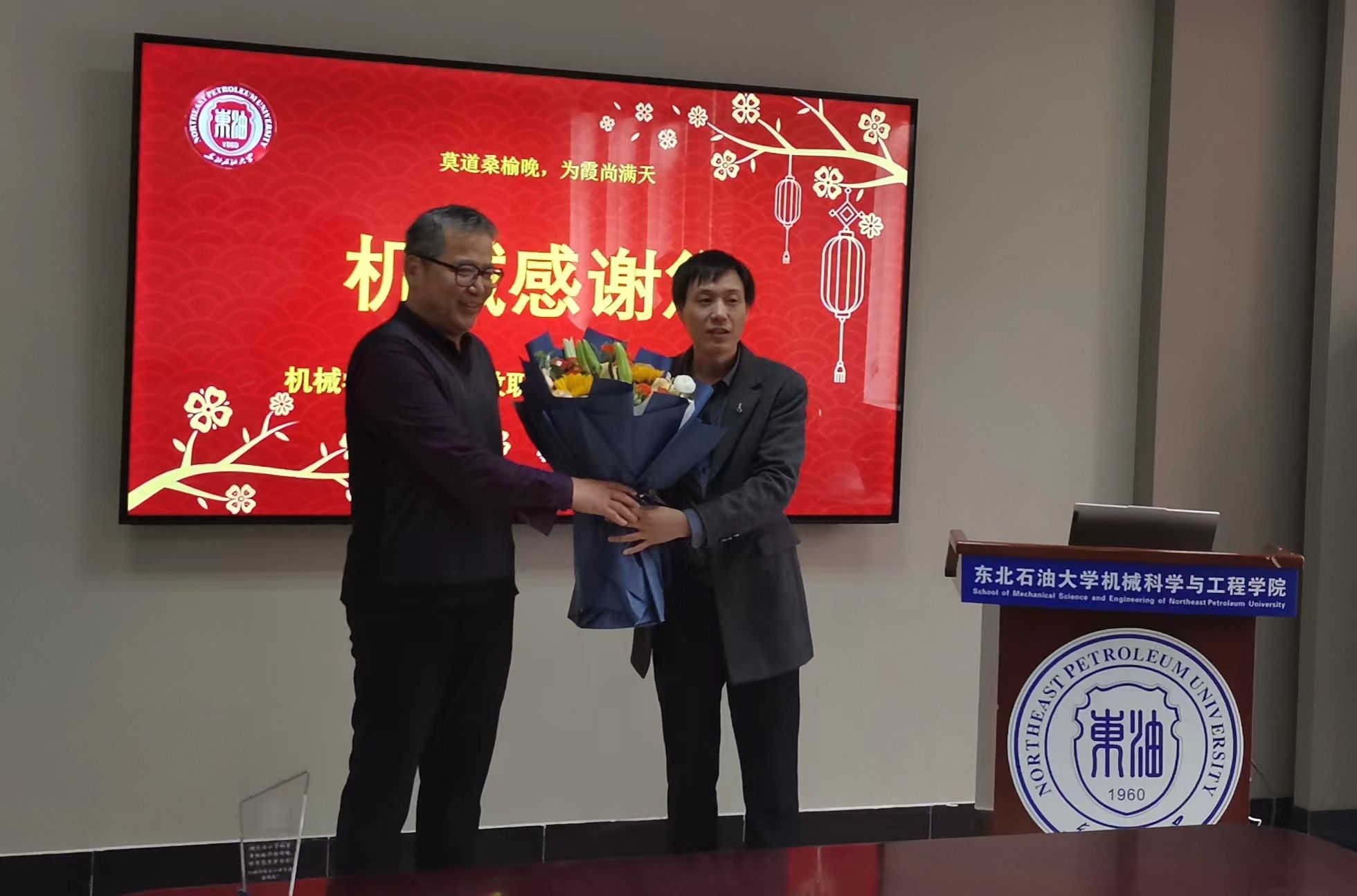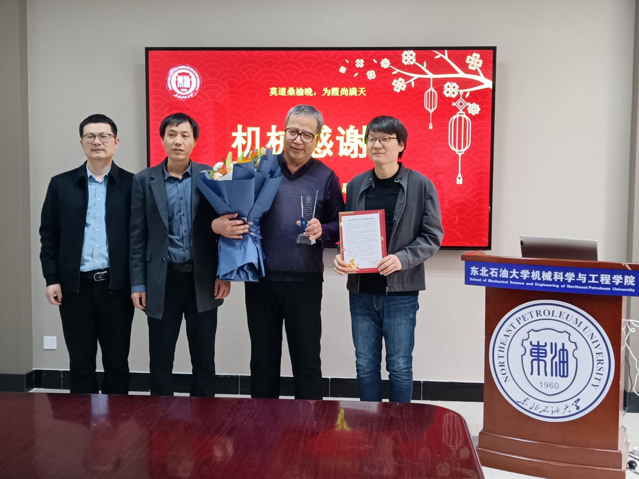 荣休仪式上,学院党委书记王勇对荣休教师为新葡萄官方网发展、学科建设和人才培养做出的突出贡献给与了高度评价,为荣休教师献花并颁发了荣休纪念品,对方华教授和姜民政教授的光荣退休表示祝贺,并表达了崇高的敬意。党委副书记闫超宣读了新葡萄官方网致荣休教师的慰问信,荣休老师从青丝到白发,倾尽丹心育桃李,用毕生心血诠释着对机械的挚爱,对学生的关爱,对教育的热爱。用勤学笃行的躬耕态度,严谨踏实的工作作风和润己泽人的奉献精神,为新葡萄官方网的发展献出了自己的青春、汗水和智慧,是新葡萄官方网的亲历者、建设者和贡献者,共同铸就了新葡萄官方网的荣光。