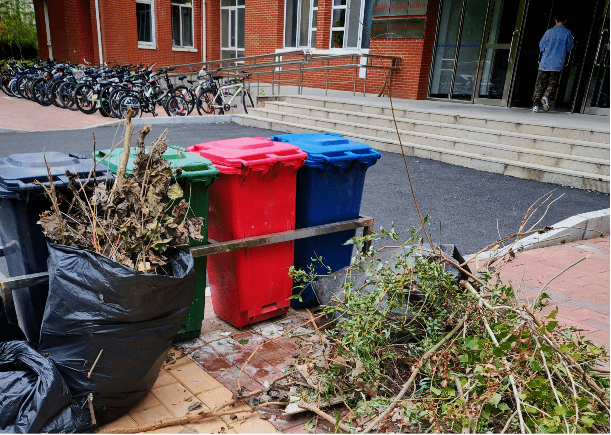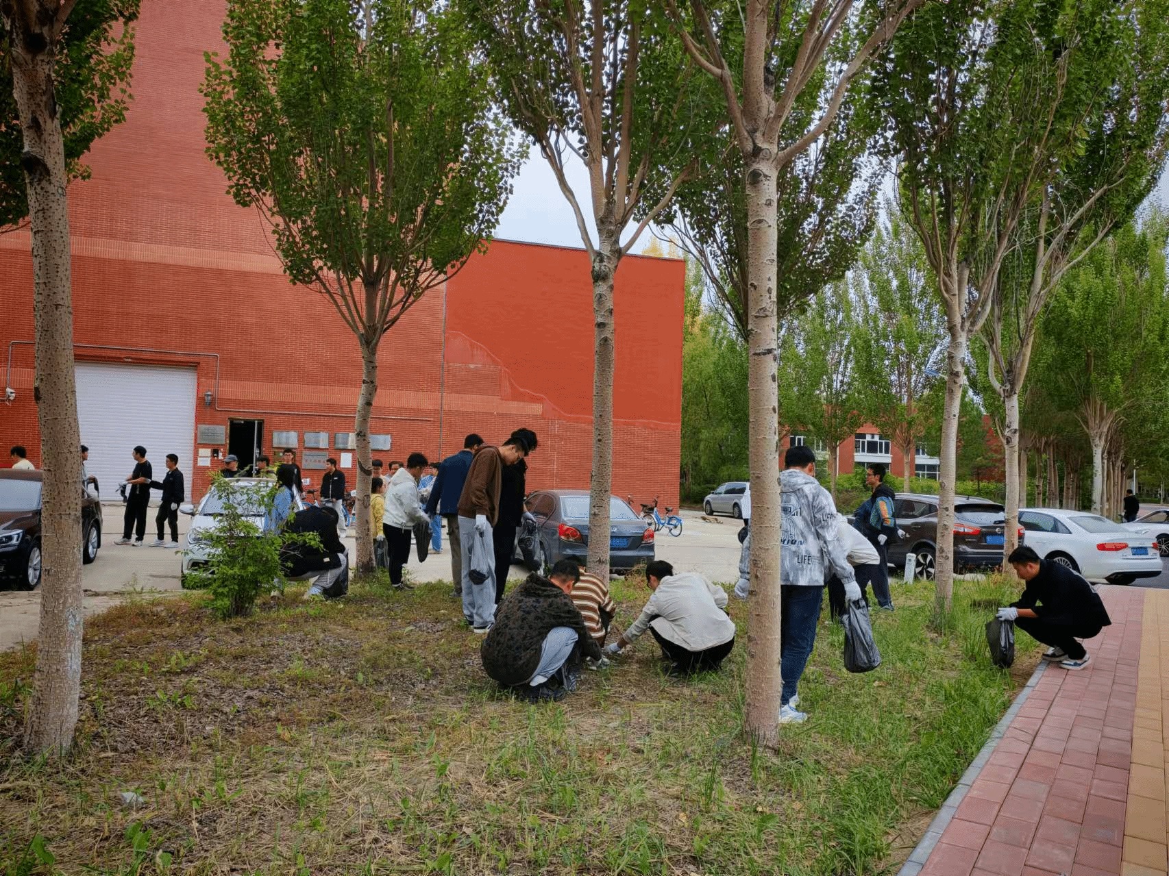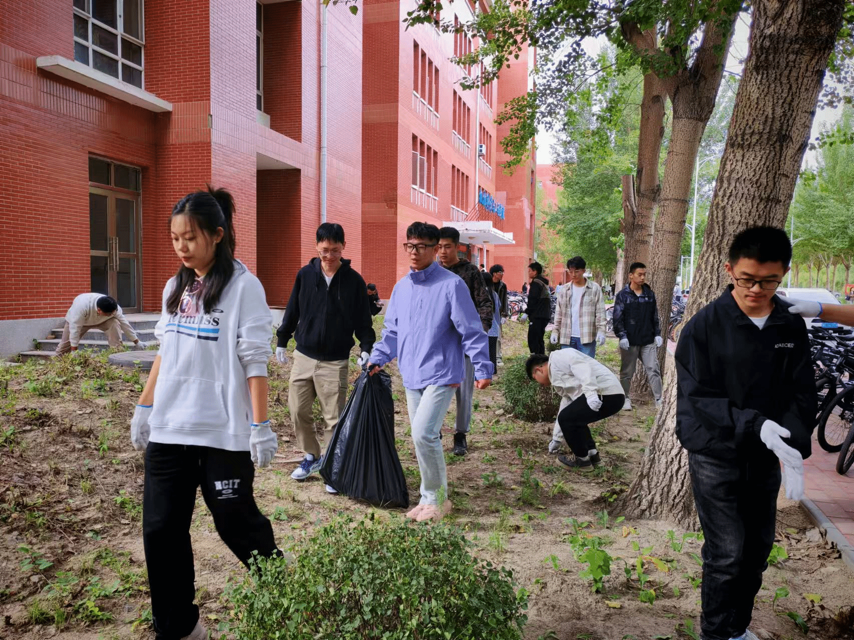 在行动中,同学们分成若干小组,每组负责不同的区域。他们装备齐全,戴着手套,提着垃圾袋,将道路、绿化带等区域的落叶、草末、树枝、砖石瓦块、白色垃圾等捡到垃圾袋中,将绿化带(花坛)中土堆、土坑整理平整,并清理责任区内商业广告,还规范了自行车的摆放。