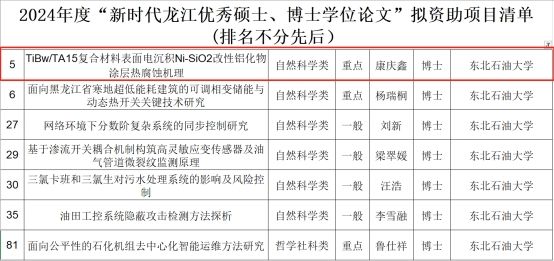 近日,黑龙江省教育厅公示了2024年度“新时代龙江优秀硕士、博士学位论文”拟资助项目清单,其中包括重点项目29项,一般项目71项。经严格评审,我校7位老师获得资助,其中新葡萄官网康庆鑫老师申请的《TiBw/TA15复合材料表面电沉积Ni-SiO2改性铝化物涂层热腐蚀机理》获得自然科学类重点项目资助。