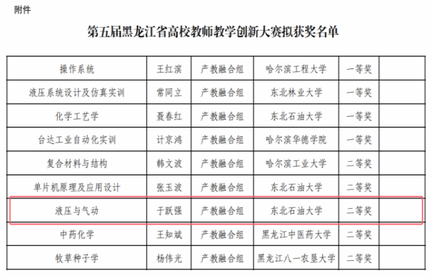 依托在大庆普罗石油科技公司开展的《液压与气动》实践课程环节以及录课视频,新葡萄官网于跃强副教授代表新葡萄官方网参加了第五届全国高校教师教学创新大赛(黑龙江赛区)产教融合赛道竞赛,成功进入黑龙江赛区现场决赛并斩获二等奖,为校企双方共同探索打造课程建设、课堂教学改革等产教融合建设增添了标志性成果。